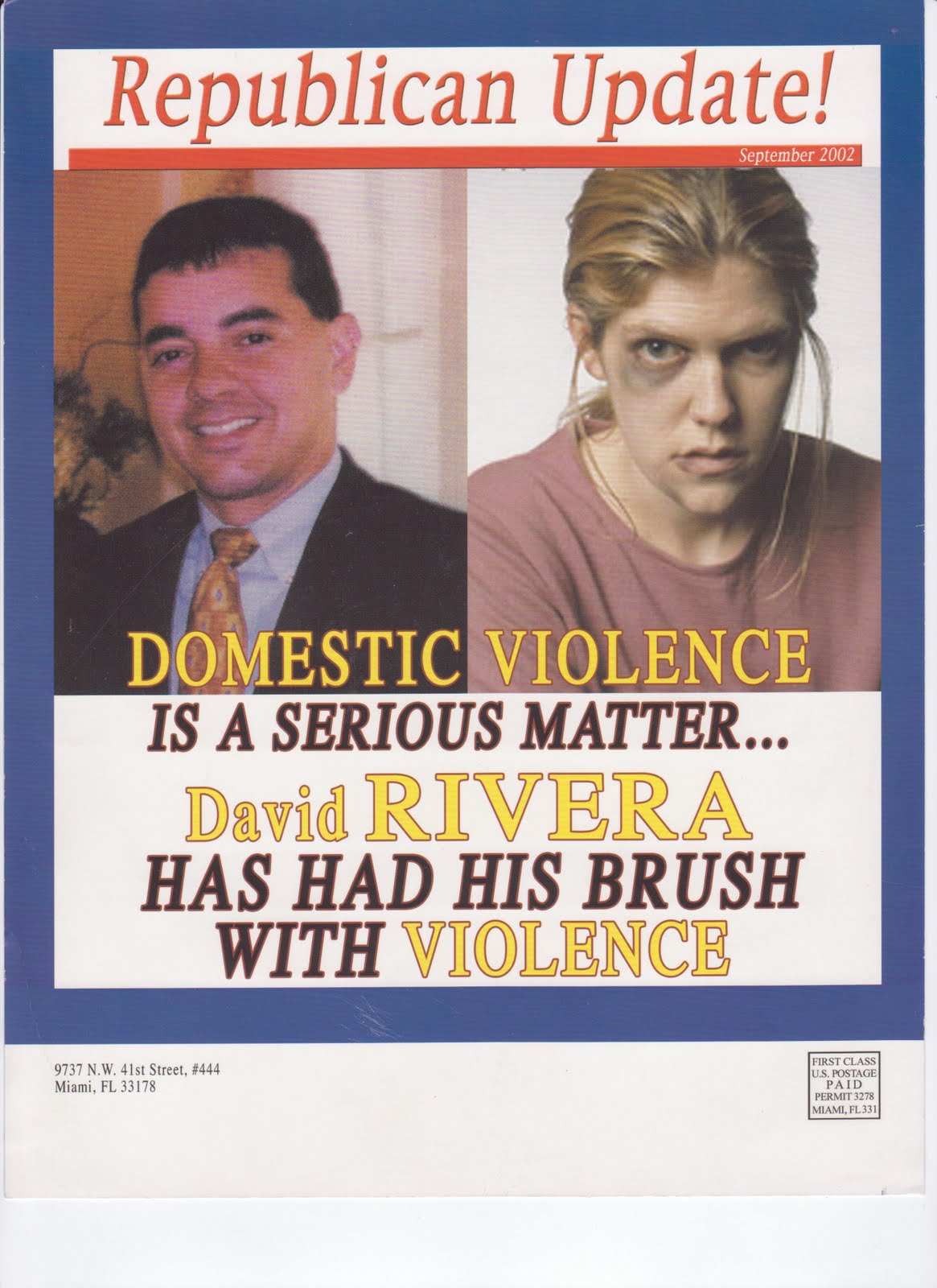 Via DownWithTyranny!, more bad stuff about David Rivera: Will Florida Republicans Put Up With A Candidate Who Beats Up Women— And Then Lies About It? (That post includes a copy of an amazing anti-Rivera campaign flyer from 2002. Miami politics is was and remains the home of the brass knuckle approach to campaigning. Note the caveat: “It is not clear if the woman photographed is Rivera's victim.”)